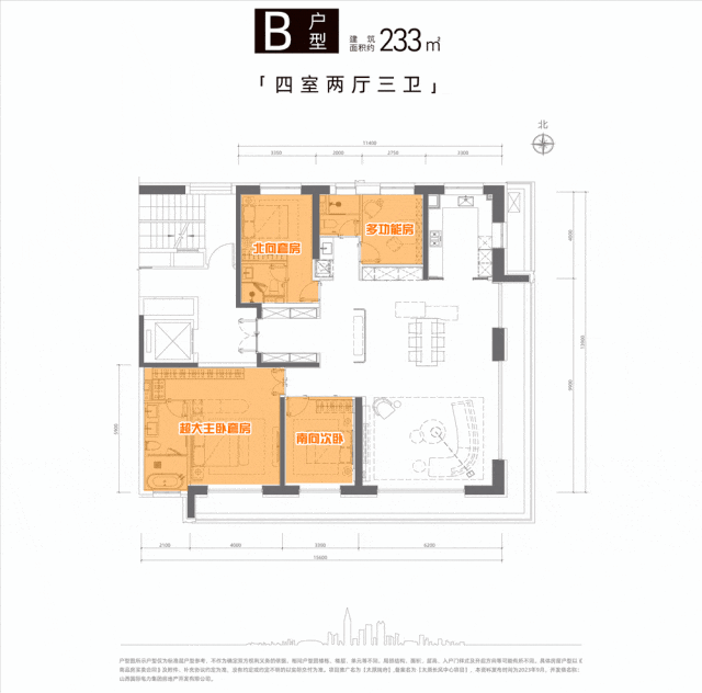 建面约233平米户型则是采用了“角厅”的设计,东、南双向均为落地推拉门,客厅、餐厅完全被景观包围。