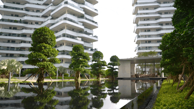 穿过美学会所大堂拾阶而上,实现从城市喧嚣切换至度假般的赏景之旅。步入森林美术馆主题园林,映入眼帘的中心水景倒映建筑、绿植、云影、天光,分列两排的小叶榕形成强烈的对仗序列感与归家仪式感,整体呈现富有韵律的园林景致。