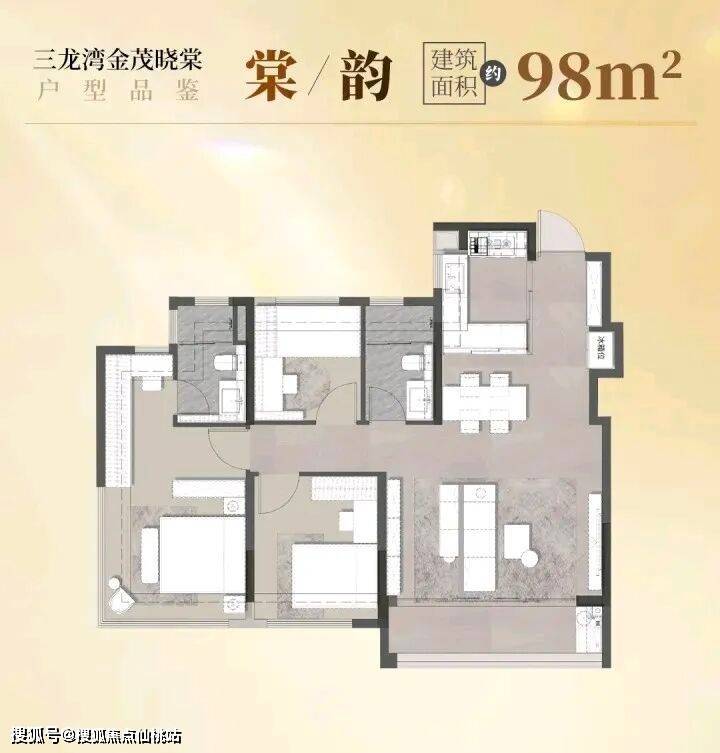 建面约98㎡:竖厅布局,三开间朝南,约5.3米大面宽客厅,次卧约3.1米面宽;主卧套房带270°飘窗环幕采光,转角衣帽间。