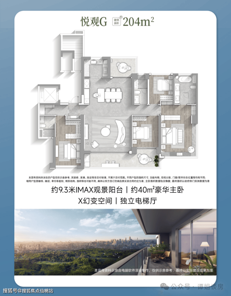 LDKG一体化设计,同享约9.3米南向IMAX观景阳台,约40㎡豪华主卧套房,静谧休憩,惬意起居,X幻变空间,多元共享,悦变生活更多想象,独立电梯厅,延续悦系仪式,私享入户尊崇归家。