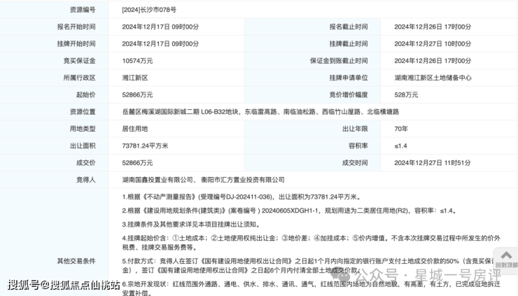 [2024]长沙市078号地块, 由 湖南国鑫投置业有限公司(2024年成立的私企)和衡阳汇方置业(衡阳市知名私企)底价竞得。宗地出让面积73781.24㎡,规划为居住用地,容积率≤1.4。成交总价52866万元,成交楼面价5118元/平方米。