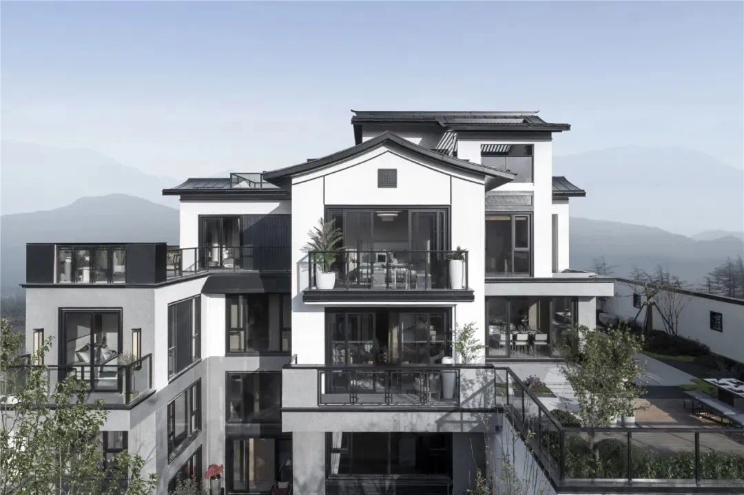 人们对于建筑美的感知往往是从外立面开始的,外立面是建筑个性和建筑风格的重要体现。国风大境外立面以铝板、肌理漆、仿石漆等材质打造轻中式风格。雪白的墙壁,青黑的瓦,黑白灰的色彩搭配,天然地势的加持,形成错落有致的建筑形态,颇具美感。