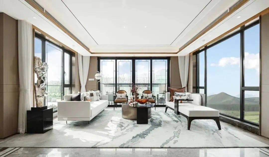竹林渐尽,一幅幅连贯的山水画卷随步行展开。设计洞悉现代人们对于诗意生活的向往,让室内与室外对话,起居之间,枯山水景致增加了生活意趣,室外流动的风景也别有韵味。