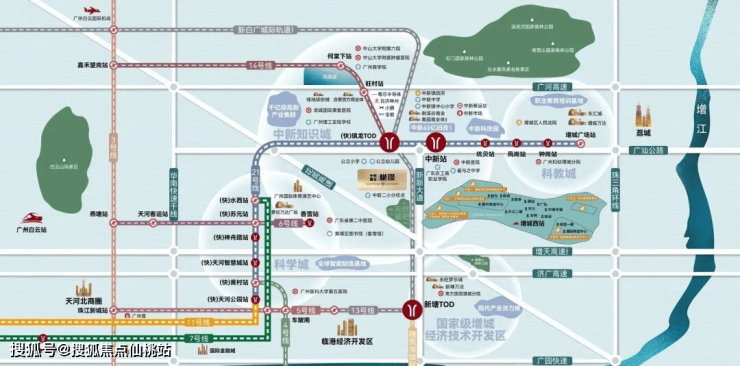 位于广州市增城区中新镇新新路16号,广州地铁21号线中新站附近;坐落黄埔中新知识城、科学城、科教城、广州经济开发区和增城经济技术开发区”三城两区”之间,占据知识城南核心位置、广深科技走廊腹地,利好加持,区域能级潜力无限。
