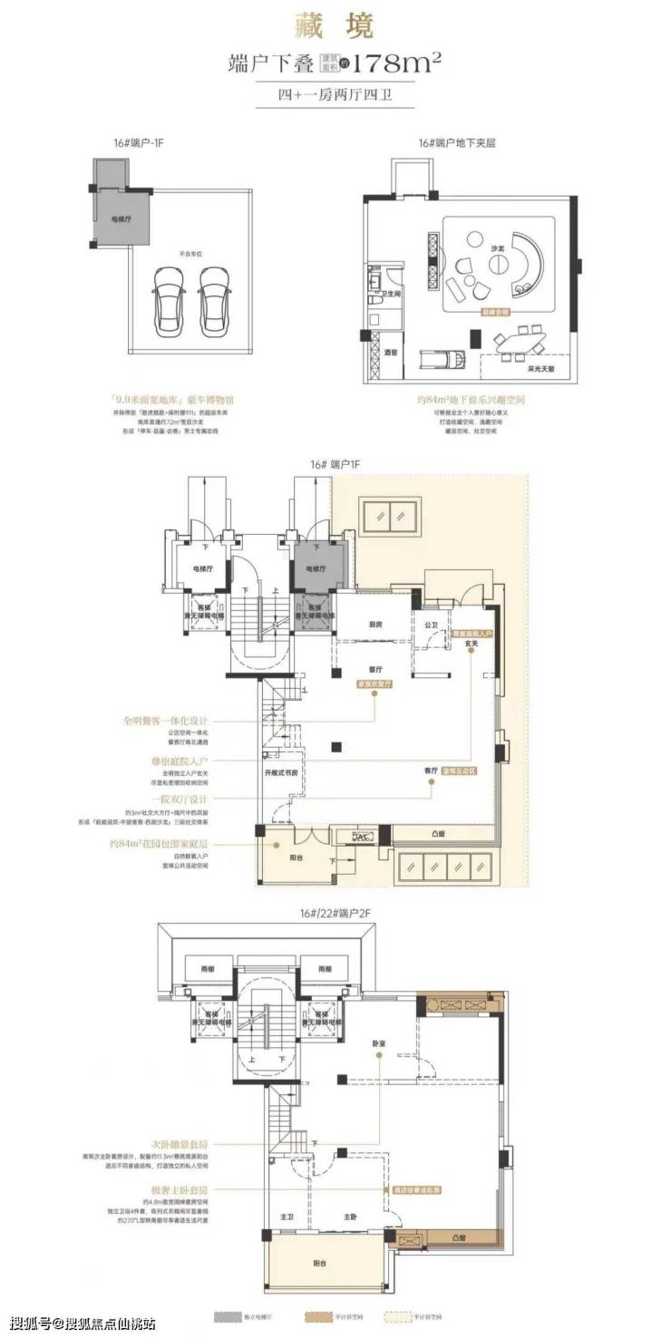 别墅产品为叠拼设计,一个显著特点是取消了市场上常见的“鸡肋”中叠,只保留上、下叠设计,这有效提升了产品的舒适度和私密性。面积段为169-178平方米左右,下叠产品带有包围式花园,上叠则有南北不计容露台。