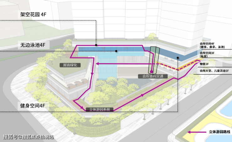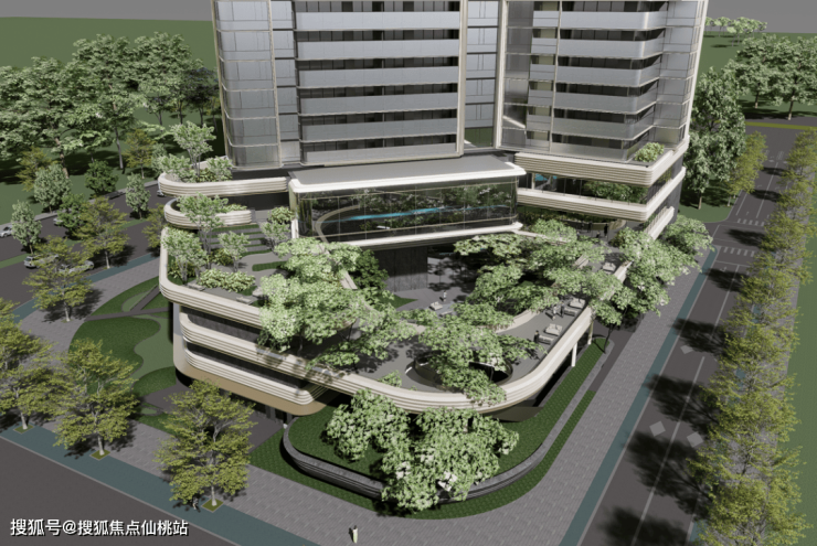 后院以游园休闲为主,设计通过将东南侧形体打开以引入立体园林,与城市界面形成呼应,借助形体减法的手法,生成退台及架空空间,并在此基础上打造空中花园及屋面绿化,以此实现多层次立体空间的营造,提升住区园林品质。