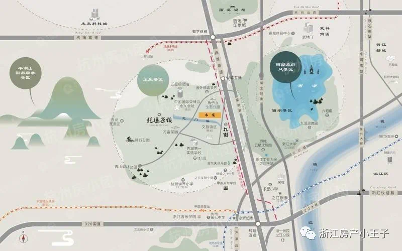 项目位于主城西湖区龙坞茶镇景区内,被西湖景区、午潮山景区环抱。龙坞茶镇为西湖龙井较大的原产地保护区,70%的西湖龙井产量来源于此,素有“千年茶镇 万担茶乡”之称,也是中国茶主题特色小镇;同时隶属于西湖南线纯低密豪宅板块。生态环境:龙坞茶镇为高级4A景区, 拥有茶园14000余亩,周围茶山连绵,山水相绕,森林覆盖率为93.4%,拥有难以复制的景观资源;负氧离子浓度常年维持在6000个左右/cm3。