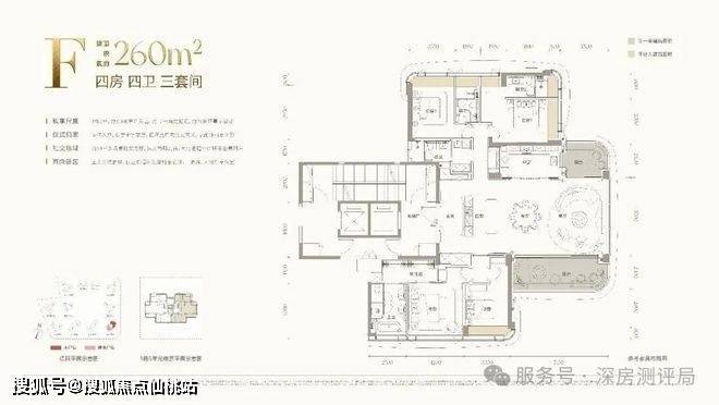 F户型:建面约:260㎡(四房四卫双阳台全景舱),主阳台开间约:7.2米,客餐厅开间约:5.7米,客餐厅厨房+阳台面积将近约:100㎡,预估套内约:218.1㎡(不计飘窗,阳台计一半),得房率约:83.88%,预估赠送面积约:40.94㎡,加上赠送套内约:259.04㎡,预估实际实用率约:98.39%,2梯2户专梯入户高端私密,260㎡四房四卫(三套房双阳台),加上赠送实用率接近约99%,户型非常实用,客厅全景舱设计,东南朝向通透格局,景观视野都达到最佳,海景、园景、摩天轮、城市夜景尽收眼底。