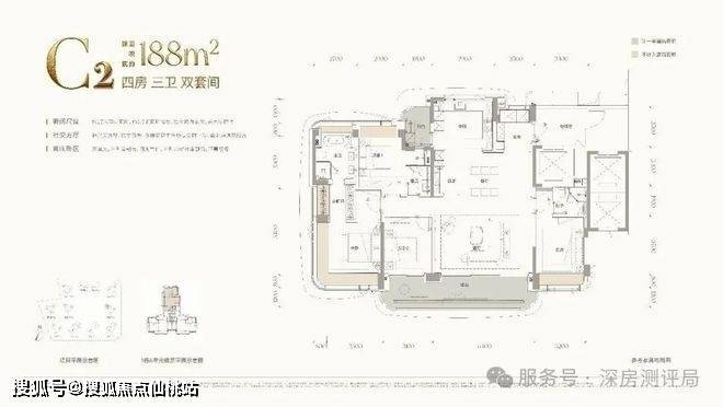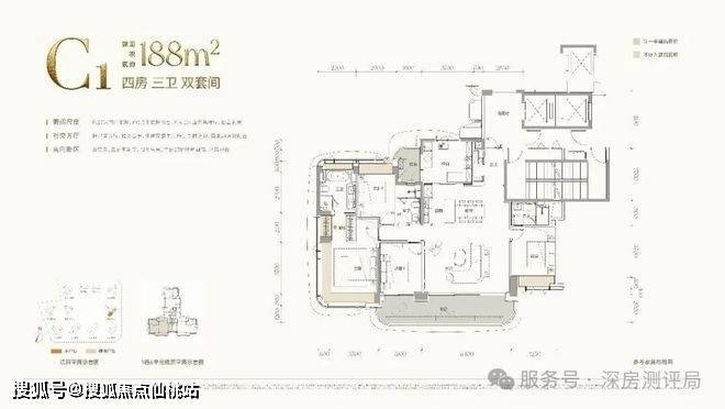 C2户型:建面约188㎡四房三卫双套间,西南朝向,和C1户型类似,在阳台朝向和入户门位置有所区别。
