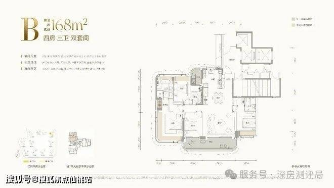 B户型:建面约168㎡四房三卫双套间,主阳台开间约:8.2米,客餐厅开间约:5.2米,3梯3户,专属电梯厅,南北通透的格局,通风采光好,满足三代同堂的居住需求,西南朝向看小区园林景观,更安静更私密,小区园林会采用立体式花园加中央水景的设计,非常漂亮。在深圳改善市场中堪称“起步即舒适”的标杆户型,动静分区清晰合理。户型核心亮点为双套间设计,主卧与一间次卧均配备独立卫浴,私密性拉满;客餐厅一体化连通巨幕阳台,采光面开阔,无论是摆放大尺度沙发,还是打造亲子互动区,空间都绰绰有余。另外两间次卧尺度适中、功能灵活,可随心改造为儿童房、客房或书房,满足多元家庭需求。整体空间零浪费、高利用率,将功能性与居住舒适度完美平衡。