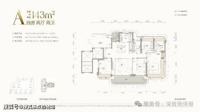 A户型:建面约:143㎡(四房两卫),主阳台开间约:7.8米,客餐厅开间约:4.8米,3梯3户,专属电梯厅,143㎡四房两卫的设计,多孩家庭轻松入住,户型兼顾实用性同时,东南朝向大阳台,看海景同时看摩天轮的景观,城市夜景也很美,是整个小区面积最小且景观最好的户型。
