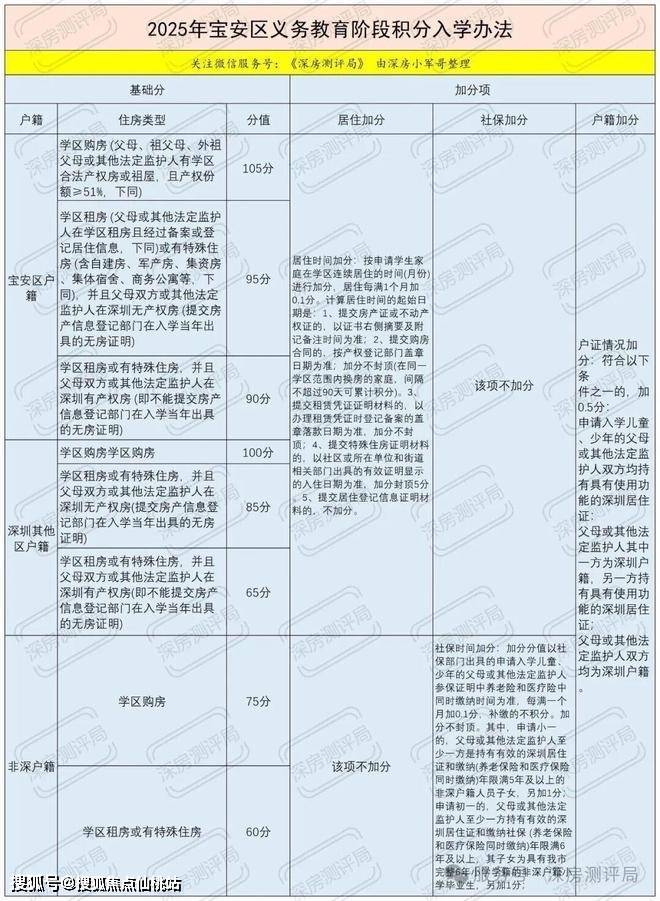 积分构成:基础分(宝安户籍 + 学区购房,产权份额≥51%)105 分 + 户籍固定加分 0.5 分 + 居住时间加分(每满 1 个月 + 0.1 分,需网格登记确认),最高基础分 105.5 分;