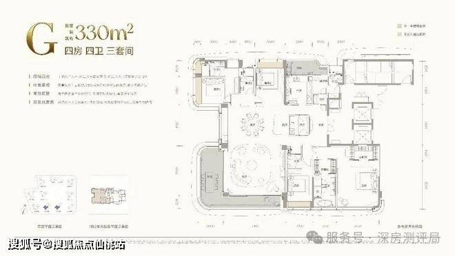 G 户型:建面约 330㎡四房四卫三套间,东南朝向,主阳台为约 17.8 米大尺度环幕全景阳台,客餐厅为十字前厅入户,约91㎡大尺度多场景转角厅,约21米东南向宽境,专梯入户直达十字前厅,每户都拥有尊崇私家门厅,私密性与仪式感拉满,主佣双动线设计,搭配超尺度户内仪式玄关,享阔绰归家体验;客厅打造多场景转角厅,兼顾家庭聚会、社交待客、私宴等多元需求,330㎡做到四房四卫三套间,中西双厨 + 独立西厨岛台 + 保姆间 + 酒窖,充分满足高端大家庭、多孩家庭或商务待客的居住需求,户型除了注重实用性与私密性,东南朝向搭配约 21 米东南向宽境与环幕端景全景视野,可揽胜天际盛景、城市繁华等复合景观,户型更升级为双总统套房格局,主卧超大总统套间配备洄游动线、大面落地窗与双独立衣帽间,私密度与奢阔感拉满,每一处空间都更舒展,居住体验更显从容。