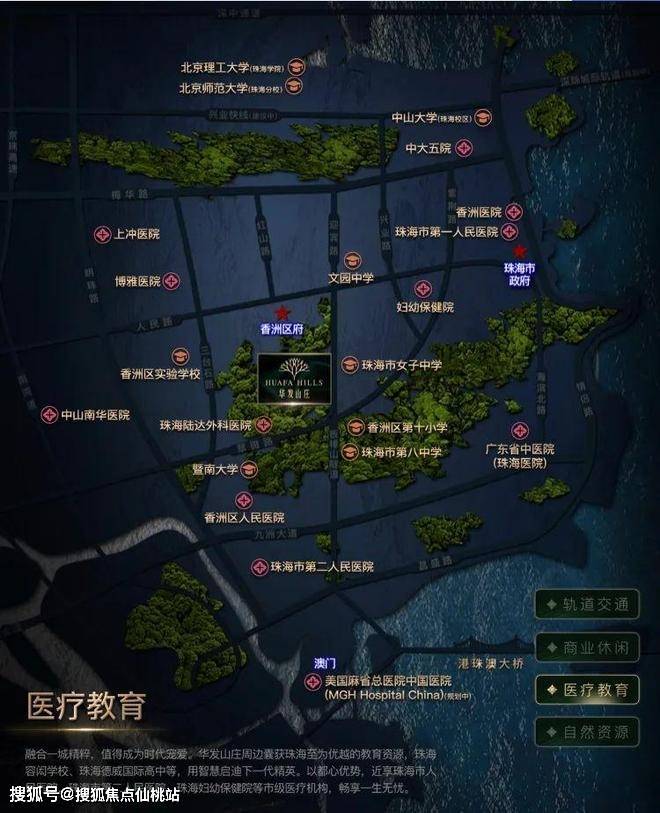 医疗配套:珠海市第一人民医院、珠海市妇幼保健院、广东省中医院珠海医院、中大五院
