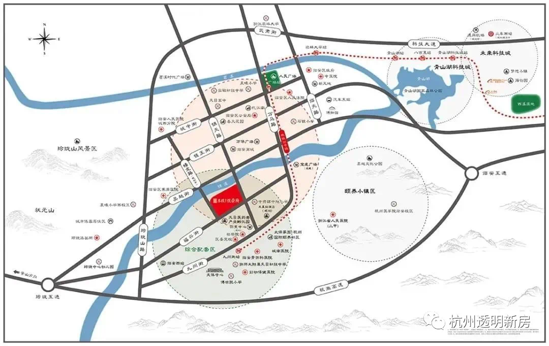 交通:东侧的锦天路是连接临安南北的重要城市中轴线,串联临安主城人居繁华。地铁16号线,汽车西站,G329国道,810路公交等。教育:东侧约500m处是中国传媒大学附属杭州临安中旭小学,博世凯实验小学;以及项目西侧约1.5公里的晨曦小学西校区;浙师大附属天目初级中学等。医疗:在项目东侧颐养小镇中在建有临安排名前列三甲医院,妇幼保健院、城南医院和骨伤科医院,