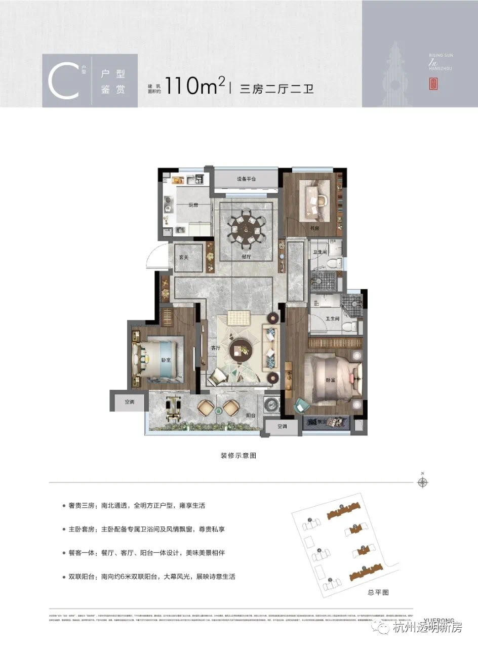 相关阅图:院落洋房C户型 建筑面积约110㎡ 3房2厅2卫奢贵三房:南北通透,全明方正户型,雍享生活主卧套房:主卧配备专属卫浴间及风情飘窗,尊贵私享餐客一体:餐厅、客厅、阳台一体设计,美味美景相伴双联阳台:南向约6m双联阳台,大幕风光,展映诗意生活?