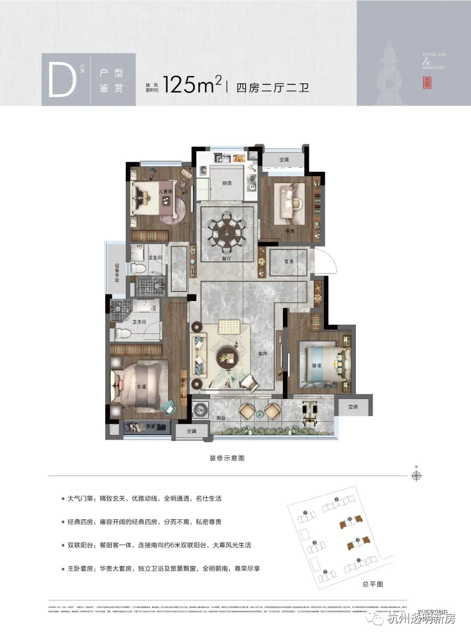 院落洋房D户型 建筑面积约125㎡ 4房2厅2卫大气门第:精致玄关,优雅动线,全明通透,名仕生活经典四房:雍容开阔的经典四房,分而不离,私密尊享双联阳台:餐客一体,南向约6m双联阳台,大幕风光生活主卧套房:华贵大套房,独立卫浴及宽景飘窗,全明朝南,尊荣尽享?