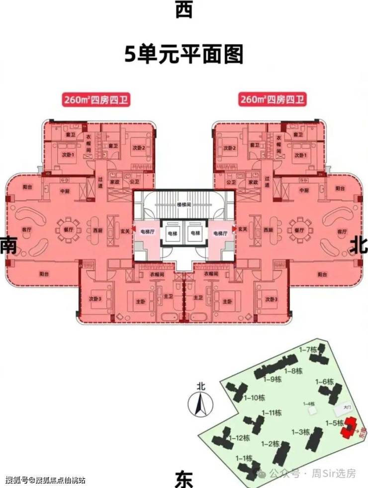 5单元,22层,层高约3.3米,2梯2户,约260平,还有一套488平顶复,可售41套;