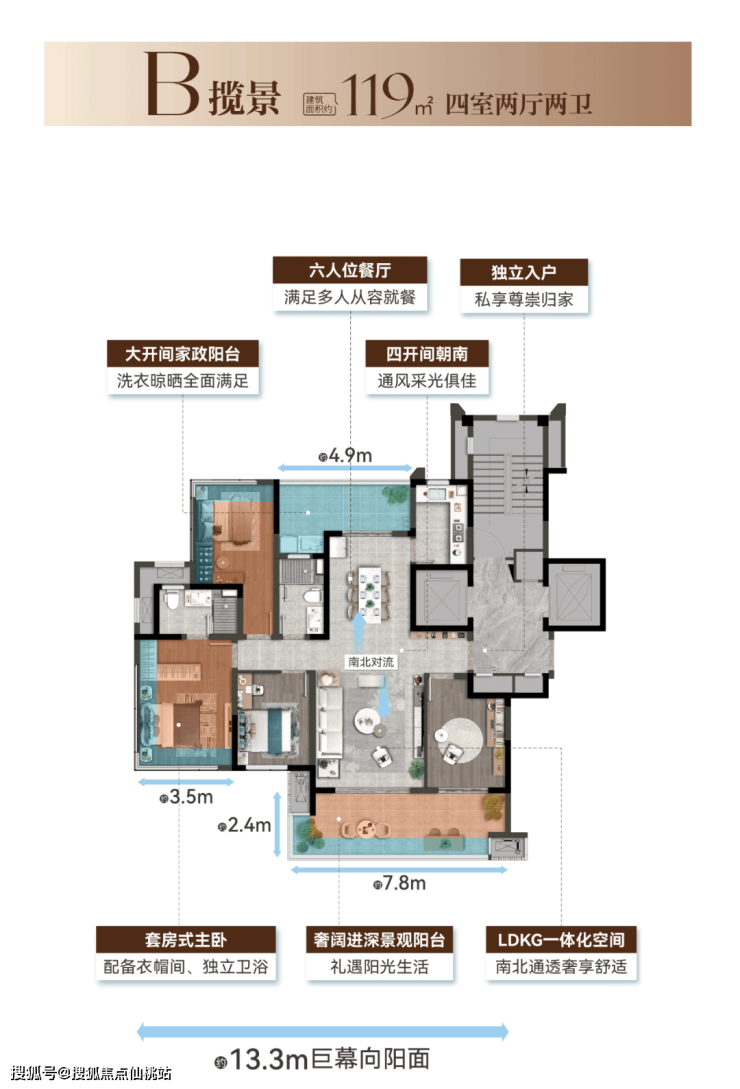 纯板楼、一梯一户、南北双阳台设计,得房率超113%。融合“确幸工坊”精装体系与人性化收纳,奢阔空间适配家庭全生命周期成长。