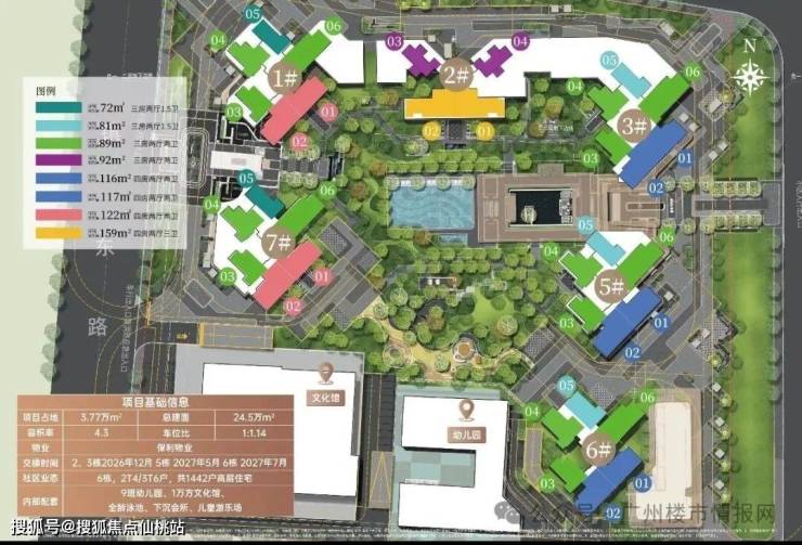 项目总建面24.5万㎡,规划6栋住宅,总货量约1400 套+,均为47层住宅,2号楼为2梯4户,其他均为3梯6户,其中,8#是5层高的文化馆,9#是配建3层高的幼儿园。