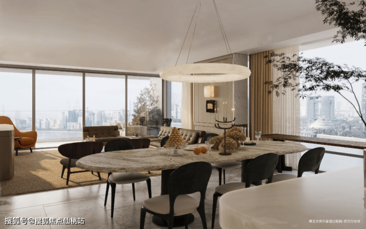 · 视野垄断:约10.8米环幕厅,南、东、北三面无死角看江,江景面宽超85%。这不是看江,是将黄浦江最精华的弯道私藏为家庭背景幕布。