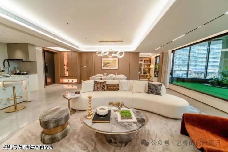 走过大气的入户玄关,推门而入便能看见近7米面宽的LDKB巨幕宽厅,宽厅与全景阳台相连,全开放的中西厨经过拓展后,整个公区面积超60㎡,气场完全不输160㎡的大平层!这里不仅是家人互动的温馨天地,即便是商务会客,或是举办一场20人的周末派对,也能轻松应对。