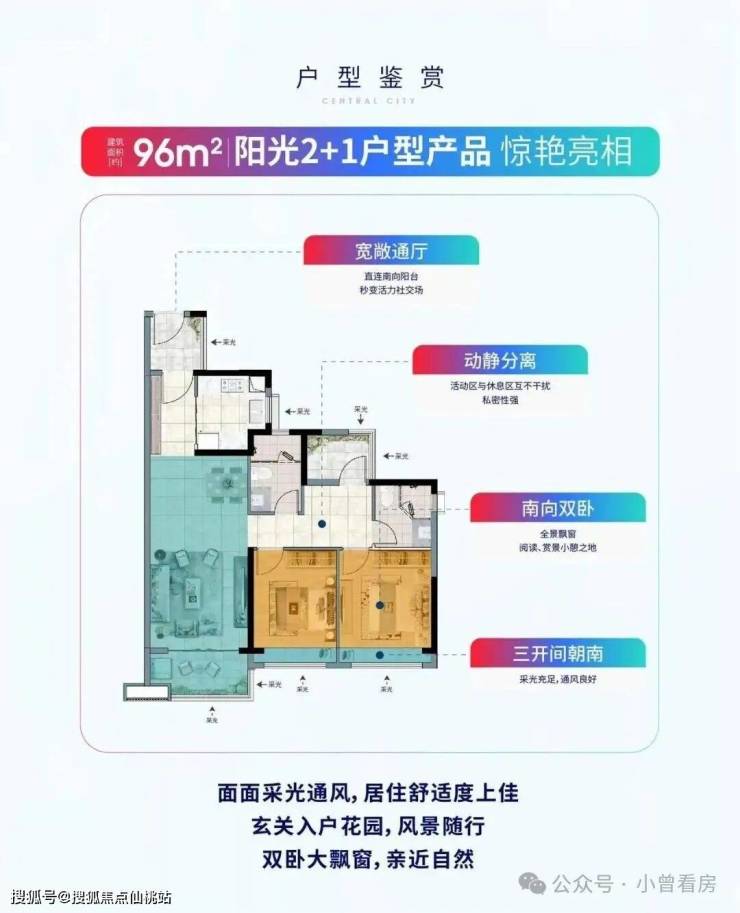 合生中央城提供的户型设计注重实用性和舒适性。项目主推建面约85-197平方米的三至四房洋房和空中复式云墅,满足不同家庭的需求。其中,85平方米的三房户型紧凑实用,适合刚需家庭;而110平方米和123平方米的户型则更为宽敞舒适,适合改善型家庭。所有户型均经过精心设计,确保每一户都能享有充足的采光和优美的景观视野,提升了居住的舒适度和幸福感。