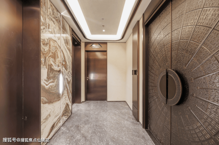 尊崇高定大堂,精研艺术与生活交融之美,雕琢金属与石材材质的自然奢华,营造艺术感的归家体验,遇鉴居者精奢高雅的审美。