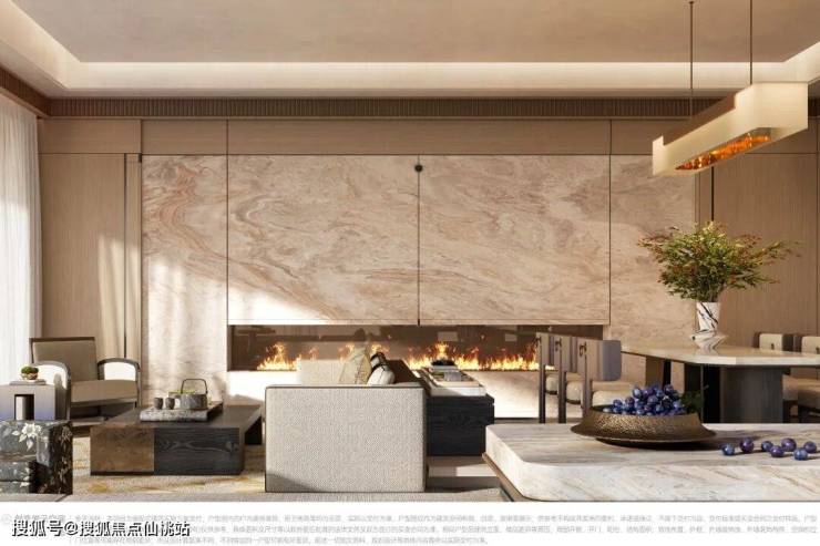 在室内,客厅背景墙使用了罗马假日天然石材,营造出含蓄高级的氛围,立体层次感非常强。