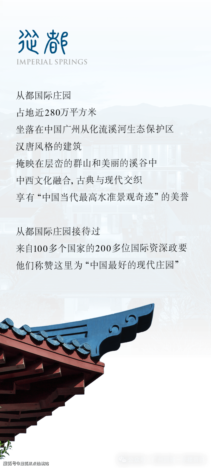 从都国际庄园从都国际庄园占地近280万平方米,坐落在中国广州从化流溪河生态保护区。盛唐风格的建筑,掩映在层峦的群山和美丽的溪谷中,享有 “中国当代最高水准景观奇迹”的美誉。