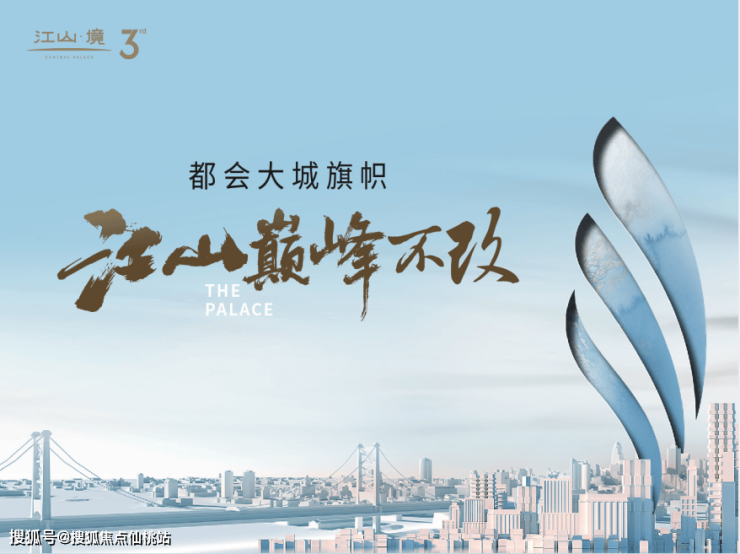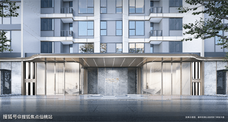 公建风立面:取简约冷色调,顶部采用折扇穿孔板造型,标准段铺排大面积流光玻璃,更以金属线条、铝板雕琢细节,如水晶般闪耀云端,尽展大宅气场