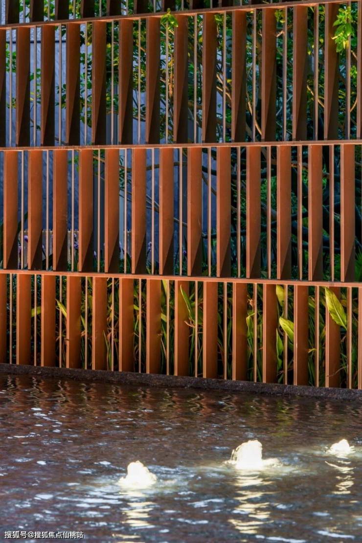 水流从精致景墙细节处跌落而下,形成小型跌瀑,下置水池,犹如明镜,动静结合,给人以优雅宁静之感。