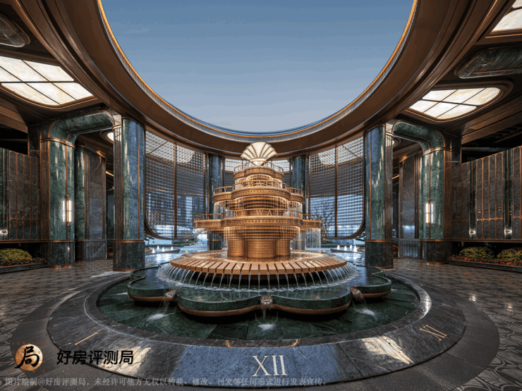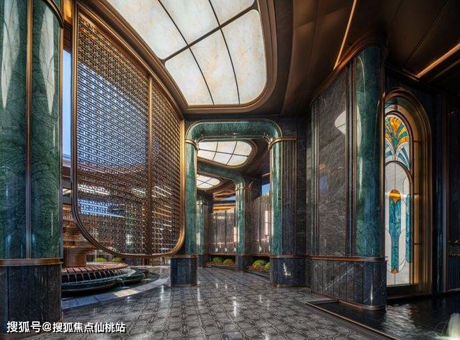 贵在风骨,而非皮相。大面积使用温德姆灰石材和普拉达绿奢石,连左右两侧拱券里面用的也是人造发光云母石。