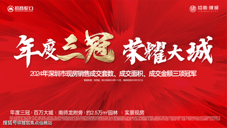 2024年招商臻城斩获2024年深圳市现房销售成交套数、成交面积、成交金额三项冠军,荣耀登顶稳坐年度三项榜单TOP1宝座。(数据来源: 克而瑞,统计区间: 2024年1月1日-12月31日,摘录时间:2025年1月1日) 在竞争日益激烈的的市场上夺得三冠,招商臻城自身的“硬实力”是必备条件!