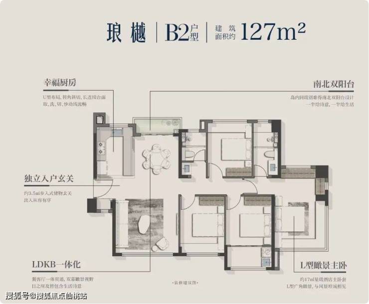 约127㎡户型,居住舒适度堪比周边140㎡以上的户型,做到了三面采光的标准正四房,还带有海景视野;