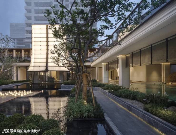 穿过归心长廊,便抵达项目"心脏地带"——中庭花园。这里被设计为开放流动的生态空间,将建筑、水景、植物与光影融为一体。花园以贯穿南北的镜面水道为核心,两侧设置方形花坛,种植形态优雅的乔木。环绕花园的是连续廊道系统,连接各功能区。
