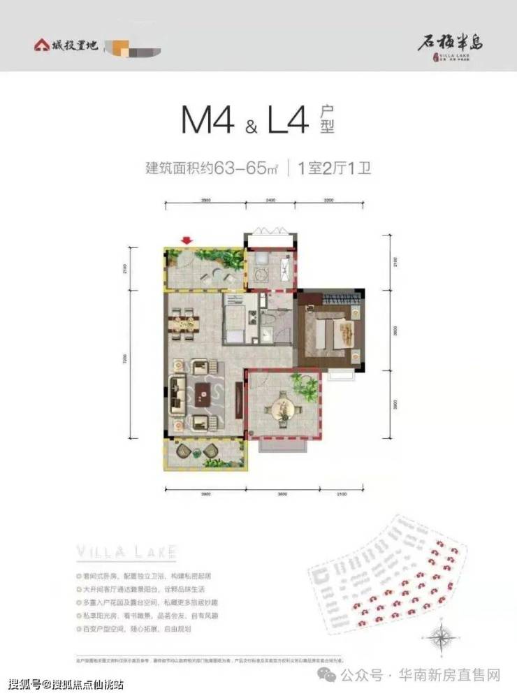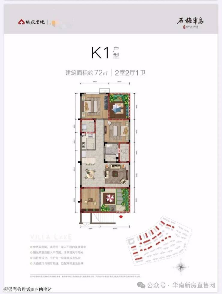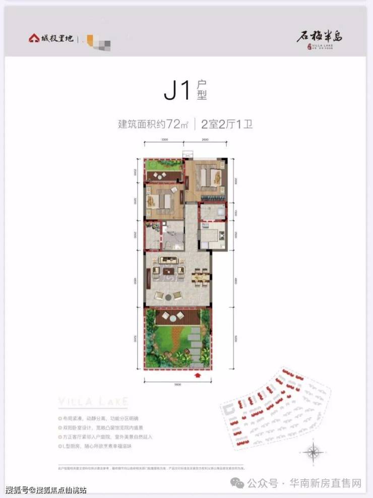 J1户型(一楼)建筑面积约72平,两房2厅一卫(平层),赠送35平花园