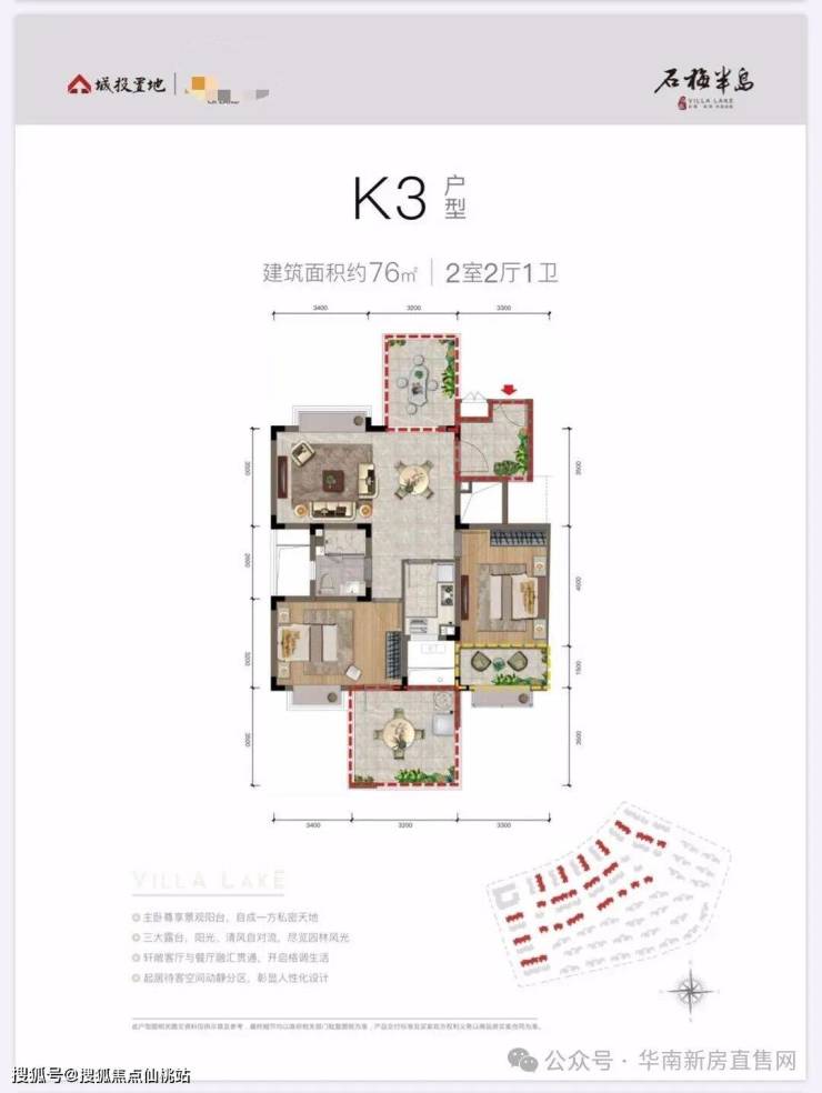 K3户型(二楼)建筑面积约76平米,两房一卫(平层),赠送30平露台