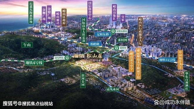 海信·松山居位于青岛市崂山区午山旁,周边商业繁华,包括万象汇、金狮广场、丽达购物中心和金鼎广场等。距离M4地铁线南宅科站仅约900米,沿线有青岛市实验初中、市实验小学、青大附院和市立医院等8所大型医院和11所优质学府。乘坐地铁可轻松到达崂山万象汇和金家岭金融区,还可以在2站换乘M11号地铁,双线地铁交通便利,尽享城市的繁华与美景。海信·松山居以崂山为背景,周围环绕着午山、莲花山和鲁度山,打开窗户就能欣赏到崂山的美景。