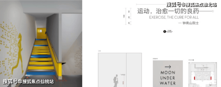 项目AB座以“乐跑楼梯”为理念对楼梯间展开设计,均配置有扶手、灯带、彩色台阶、新风系统等,同时设有鼓励运动的提示标语,以此来鼓励住宅用户更多地使用楼梯来增加锻炼、健身的机会。AB座的楼梯间设置有可开启窗扇,天然采光和自然通风效果良好,并且具有良好的视野。