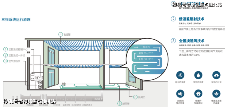 健康且舒适的室内环境,是健康建筑的核心价值。本项目采用三恒系统,该系统集辐射供暖、辐射供冷、置换新风、除湿加湿过滤、室内环境监测、APP控制、远程后台监测等功能于一身,能够全面解决用户对居住环境的温度、湿度、含氧量、洁净度、低噪音等方面的需求。后台监控具备监视、数据管理、通讯、故障报警推送等功能,用户可通过手机APP远程控制系统,实时查看系统运行状态和室内环境参数,并实现远程控制和调节,从而保证室内空气质量。