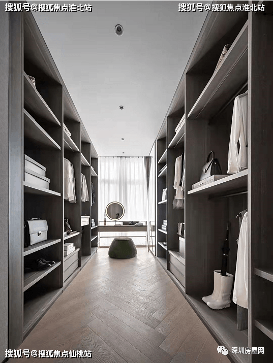 整体是做了动静分离的设计,有四个套房五卫,加一个保姆套房和书房。270度的主卧给你视觉冲击,独立的衣帽间以及一个三分离主卫,也是特别的奢侈。除此之外朝南三开间自西向东分别是老人房,次卧。老人房和次卧都做了全明飘窗,还有一个干湿分离的卫生间,入门一排衣柜。
