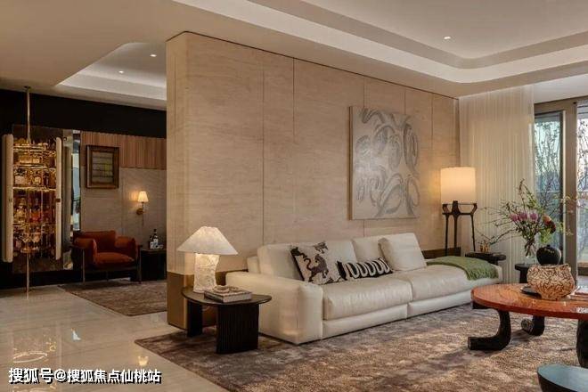 踏入客厅,视线随茶几的弧线桌角而延伸,湖光城色与室内繁花交相辉映。夕阳映照下,客厅如同一幅自然舒展的长卷,包容下居家生活的多元情绪。