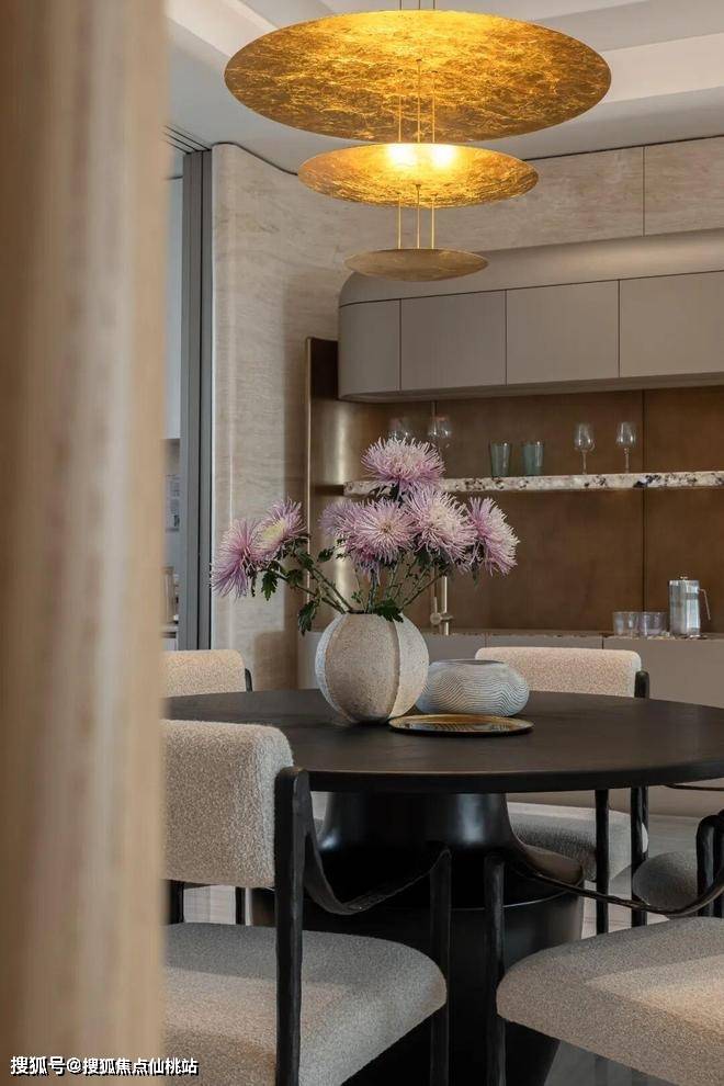 墙体的莱姆石、米色系布艺和家具的原木感构成“中古”的底色,古铜色餐酒柜、金色灯具又点亮空间的“摩登”感。在新旧的风格碰撞中,植于心底的鹭韵风华静静流淌。