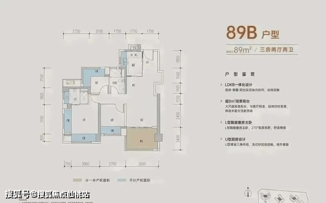 89㎡的3房2厅2卫,B户型,设计的是经典竖厅格局,进门入户玄关,客厅3.5米开间,三开间朝南,,主卧+1个次卧270°飘窗,3个卧室分别做到了主卧15.1㎡/次卧8.52㎡/次卧7.77㎡(包含墙体飘窗),得房率约:77.39%(不含赠送),西南朝向。赠送面积16.96㎡,加上赠送得房率96.84%。