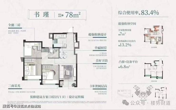 ✔️ 79㎡三房三面采光,主卧兼容1.8米床+整面衣柜[1]