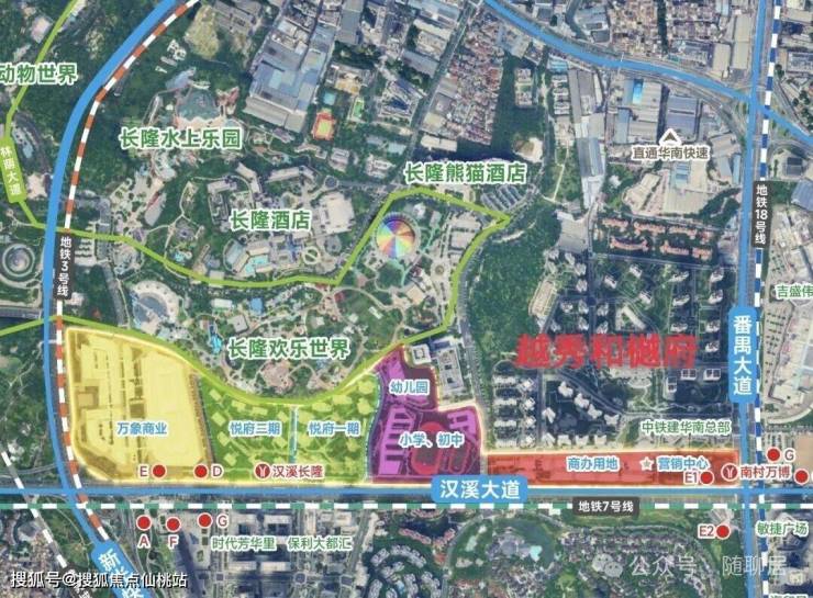 五大商圈规划:长隆-万博五大商圈排名第二,重要性仅次于天河路—珠江新城,经历12载发展,万博兑现程度远超其他商圈,汇聚39座甲级写字楼、10大型商业体、超约2.2万家企业。