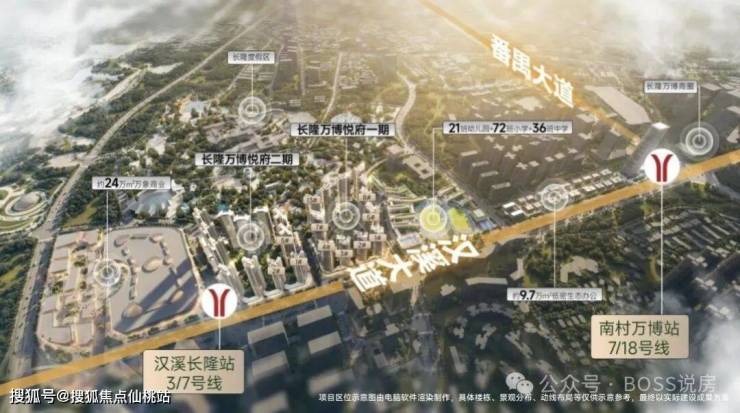 项目三地铁交汇,距 3/7 号线汉溪长隆站约 250-500 米,步行约 8 分钟可达,距 18 号线万博站约 1.2 公里,二期更靠近地铁口,地下 “万象之路” 直连地铁。
