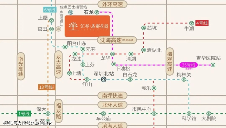 项目位于龙大高速水朗出口旁,紧邻地铁25号线石龙站(在建中,预计2028年通车);邻近地铁13号线(在建中),地铁6号线官田站,1站阳台山站 (在建中),5站深圳北站,7站抵达福田;畅享龙大、南光、广深、沈海 (机荷) 四大高速路网,出门即上高速,自驾通达全城。社区接驳优点巴士,6条短线直达6大地铁站 (龙胜、元芬地铁站接驳已开通),3条快线直达车公庙/大剧院/科技园等中心区。