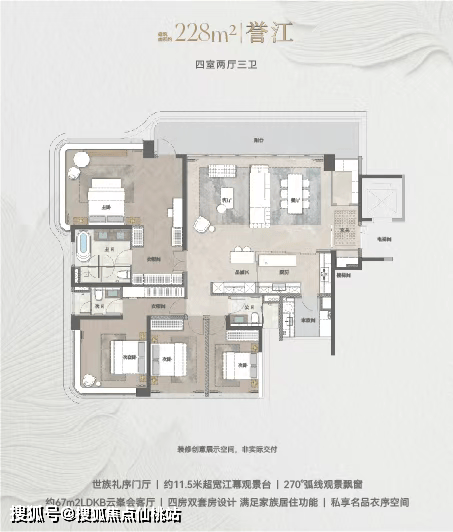 228㎡四室两厅三卫:配约 11.5 米超宽江幕观景台、约67㎡LDKB 云峯会客厅,双套房设计满足家族居住需求;205㎡四室两厅三卫:以42㎡洄游方厅、10.5 米奢阔观景露台为核心,强化空间通透感;133㎡四室两厅两卫:纯南向园景单边户,6.8米超阔观景台+LDKB一体化设计,兼顾实用性与景观体验,适配不同改善客群需求。